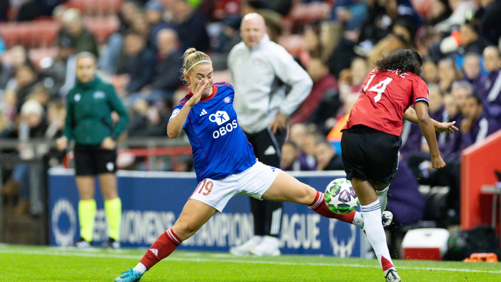 Det ble en intens åpning på årets Champions League-seriespill da vi møtte Manchester United på Leigh Sports Village. Høyt press gjorde at vertene slet med å spille seg ut de første minuttene, og etter 23 minutter kunne Olaug Tvedten gitt oss ledelsen da hun kom fri foran mål – men keeper var nede og reddet skuddet.